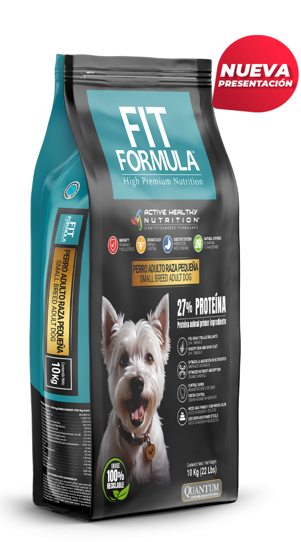 FIT FORMULA® Adulto Raza Pequeña, es un alimento completo y balanceado desarrollado con ingredientes de alta digestibilidad, maximizando la capacidad de su mascota para absorber los nutrientes, satisfaciendo todos los requerimientos nutricionales de los perros adultos en manutención.